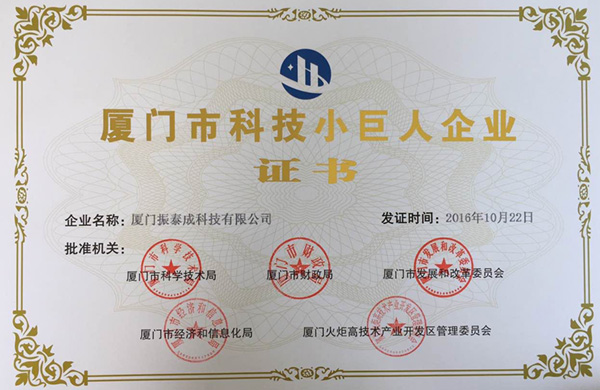 熱烈祝賀我公司廈門振泰成科技有限公司于2016年10月獲得獲得“廈門市科技小巨人”的榮譽(yù)證書,謝謝廈門市科學(xué)技術(shù)局、廈門市財(cái)政局、廈門市經(jīng)濟(jì)和信息化局、廈門火炬高新技術(shù)產(chǎn)業(yè)開發(fā)區(qū)管理委員會(huì)和廈門市發(fā)展和改革委員會(huì)對(duì)我司的高度肯定!
